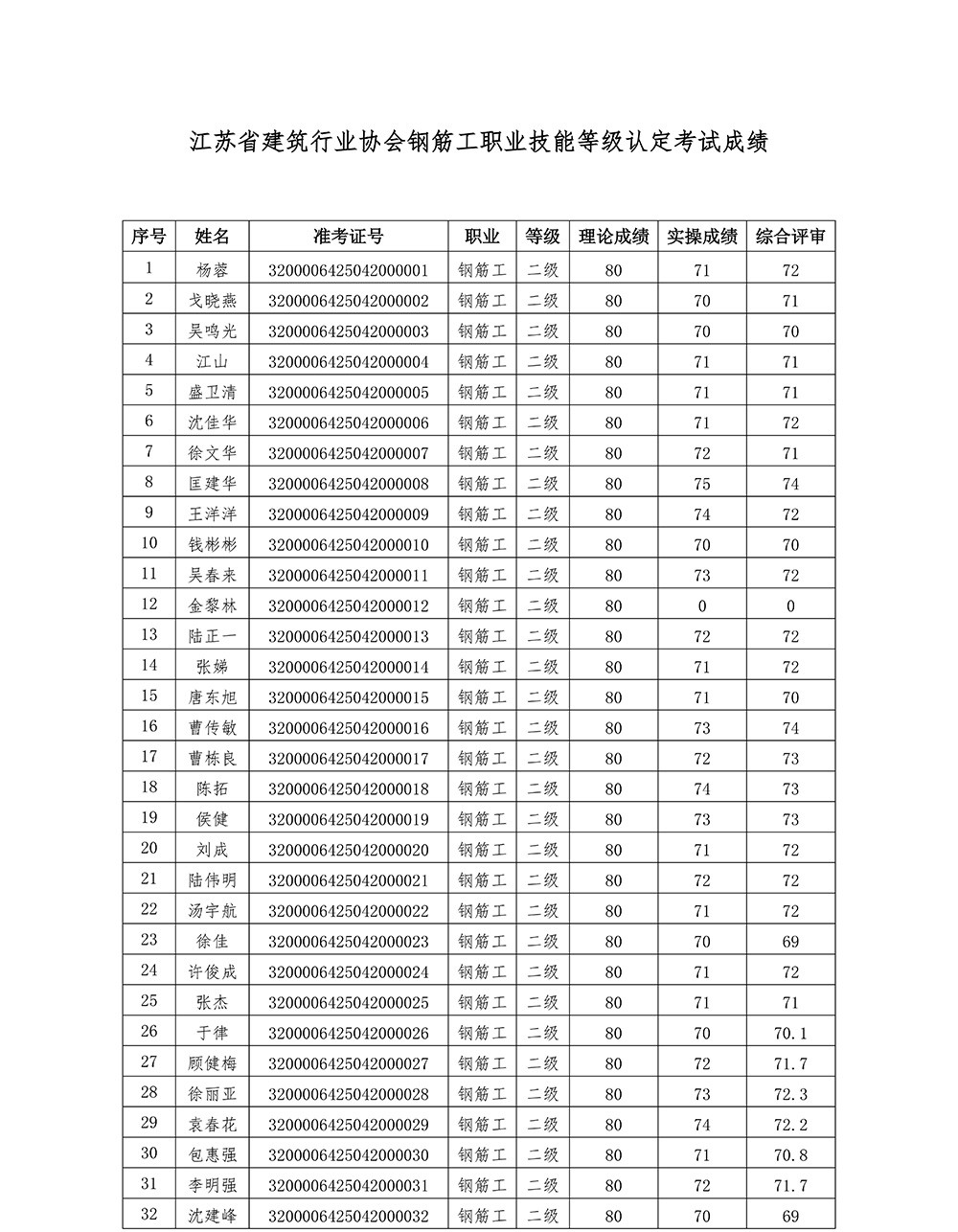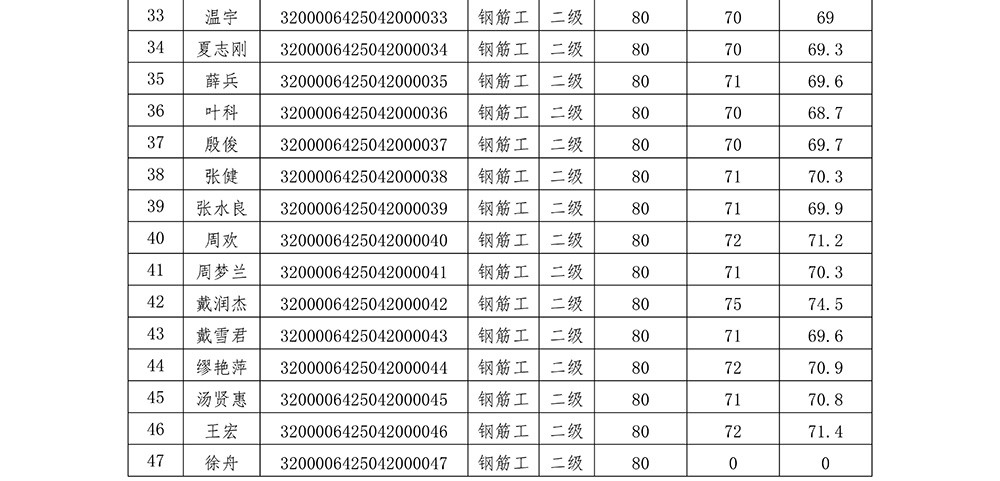 我会于2025年4月20日组织开展了钢筋工二级职业技能等级认定(认定批次号:2025-32000064-00005),现将考试成绩公示如下,公示期5天。