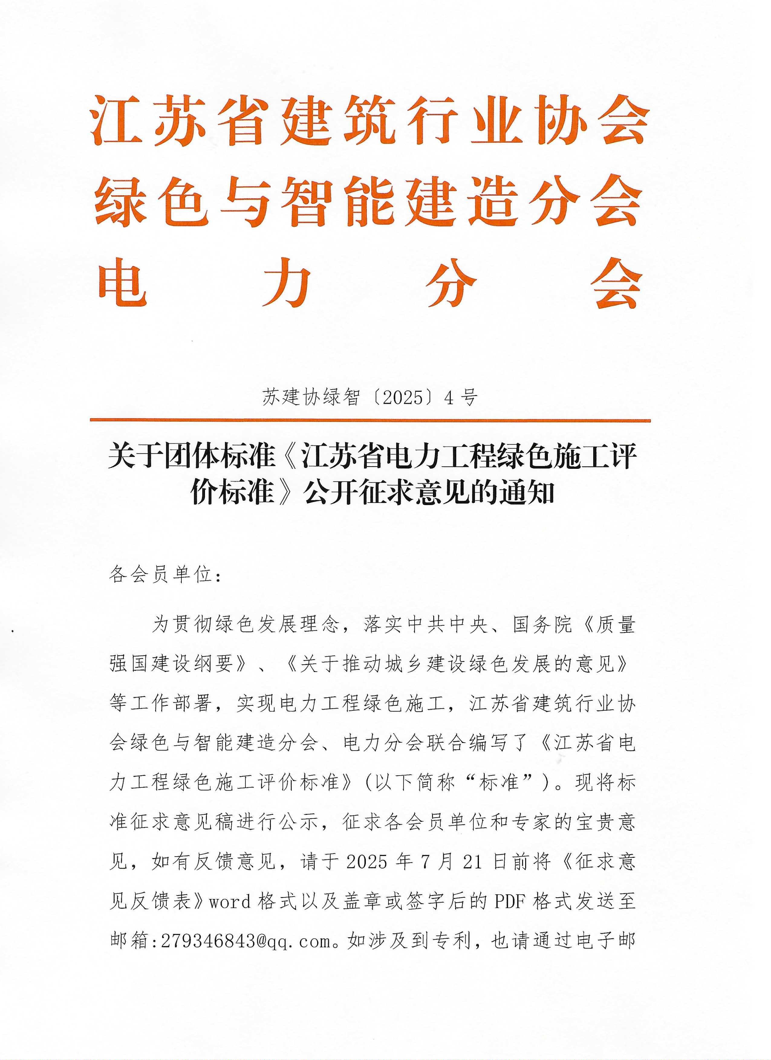关于团体标准《江苏省电力工程绿色施工评价标准》公开征求意见的通知